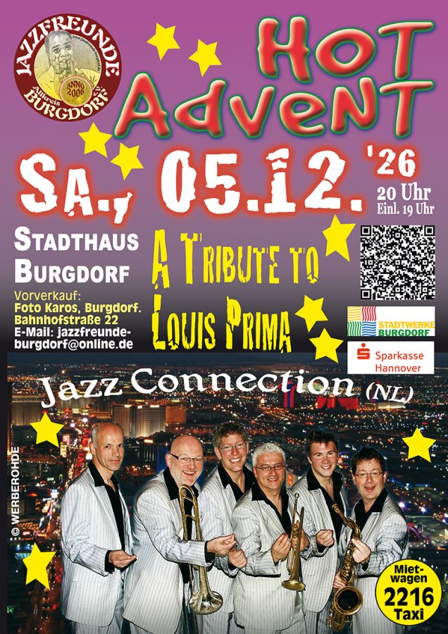 Jump & Jive, Jump Blues und Rhythm ‘n´ Blues präsentiert die “Jazz Connection” aus den Niederlanden in einem herrlich swingenden Mix aus Jive Boogie, Jazz, Blues und Swing. Die Jazzfreunde haben die Herren zum Hot Advent am Samstag, 05.12.2026, ab 20:00 Uhr, im Stadthaus Burgdorf zu Gast.