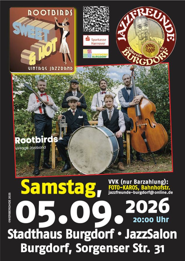 Junge Leute mit altem Jazz. Das ist das Motto des Gigs mit den Rootbirds am Samstag, 5. September 2026, 20:00 Uhr, im Stadthaus Burgdorf, Sorgenser Straße 31.
