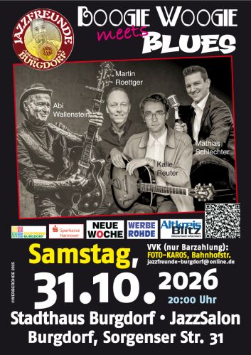 In der Formation "Abi Wallenstein & Three Generations Bluesband" stehen Kalle Reuter und Martin Röttger mit dem "Vater der Hamburger Bluesszene" Abi Wallenstein und Matthias Schlechter am 31.10.2026 auf der Bühne des Stadthauses Burgdorf.