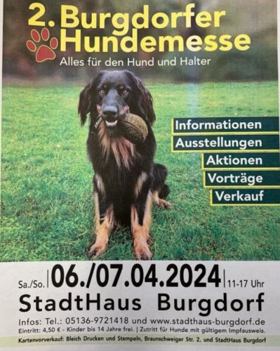 Die StadtHaus Burgdorf gGmbH ist am Samstag und Sonntag, 6. und 7. April 2024, von 11.00 bis 17.00 Uhr Gastgeber der 2. Burgdorfer Hundemesse. Nach dem großen Erfolg der eintägigen Premiere im vergangenen Jahr findet der Spezialmarkt in diesem Jahr an zwei Tagen im Veranstaltungszentrum StadtHaus (Sorgenser Str. 31) statt.